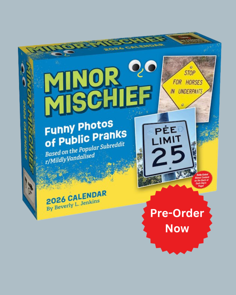 While I’m here, I’d like to announce even more good news on the calendar front! Not only have Animals Being Derps and You Had One Job! been renewed for 2026, but I’m also working on a brand new daily calendar for 2026 called Mildly Vandalized. It’s based on the hilarious subreddit of the same name, and it features funny and sometimes kind of pervy (yet largely innocent and definitely safe for work!) graffiti and other harmless acts of silliness. As an example, check out my list 25 Times A Mild Act Of Vandalism Made Us Bust Out Laughing.