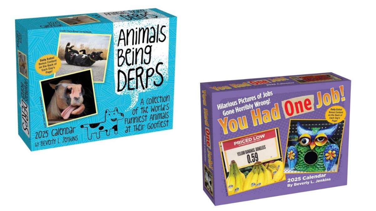 I have two very funny day-to-day desk calendars available for your consideration for 2024. “You Had One Job!” is a perennial favorite, featuring hundreds of work-related fails and general ineptitudes spotted by social media users from all over the world. “Animals Being Derps” is a collection of the world’s funniest animals at their goofiest, from dogs and cats to reptiles, rodents, wild animals, and more. All images are hand-selected and accompanied by witty captions written by me, Beverly L. Jenkins.